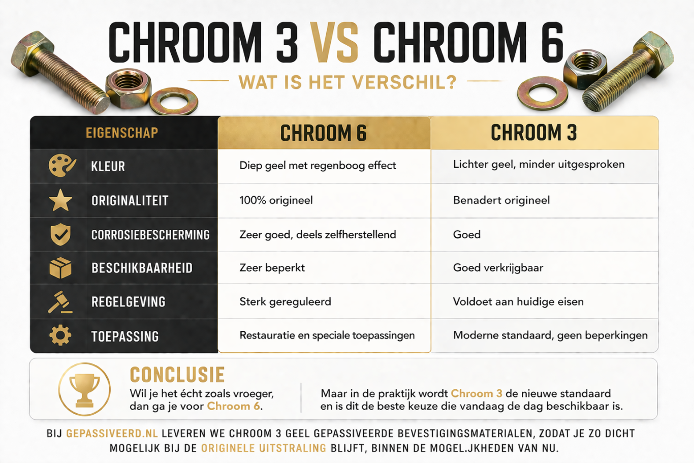 Tegenwoordig is Chroom 3 de standaard. Wij leveren dit gewoon geel gepassiveerd, alleen iets lichter en minder uitgesproken dan Chroom 6.